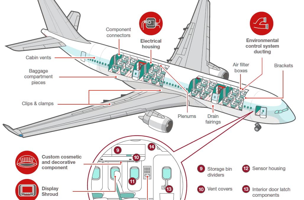 Enfin, on peut aussi citer les panneaux de cabine ignifuges installés par Airbus en partenariat avec Matérialise. La fabrication additive et leurs structures internes ont permis un poids allégé de 15% !