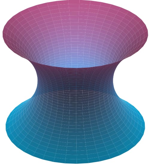 Au 18ème siècle, des physiciens et des mathématiciens, qui étudiaient l’énergie potentielle d’un film de savon, cherchaient à déterminer les équations régissant leurs surfaces (Figure 1-a). Dans ce contexte, la caténoïde fut la première surface minimale identifiée et découverte par Leonhard Euler en 1744 (Figure 1-b) [1].