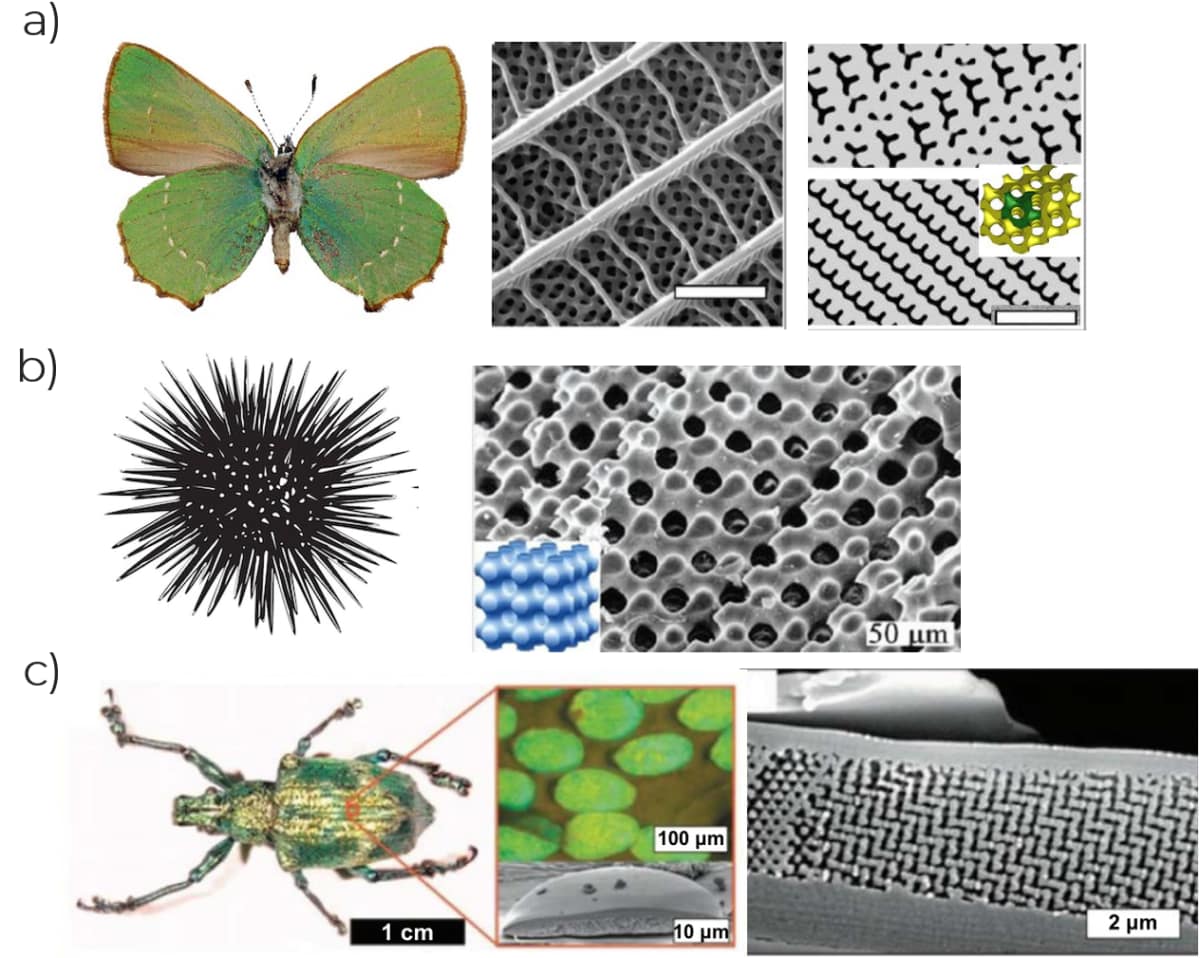 Figure 3 a) ailes de papillon ; b) Structure osseuse de l’oursin ; c) carapace de Charançon